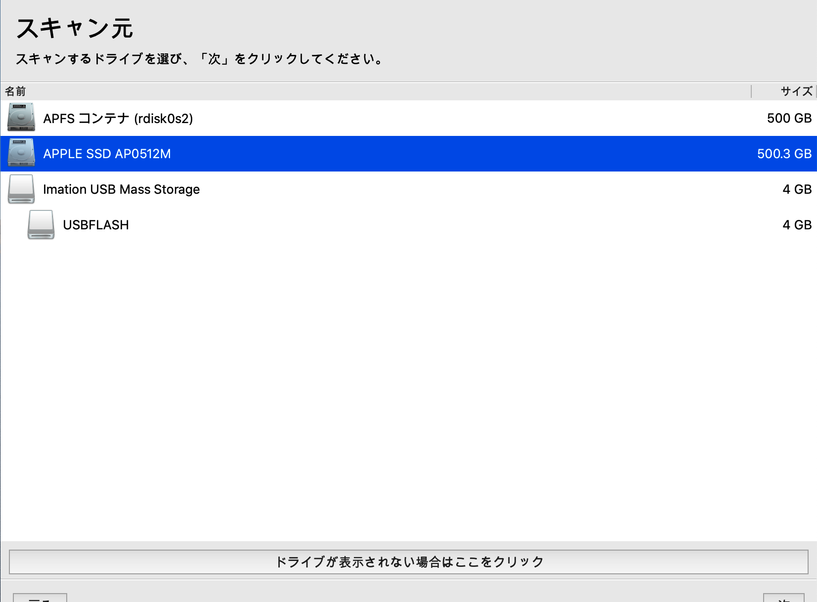 | 起動ドライブではない 内臓ディスクをスキャンして復旧 |