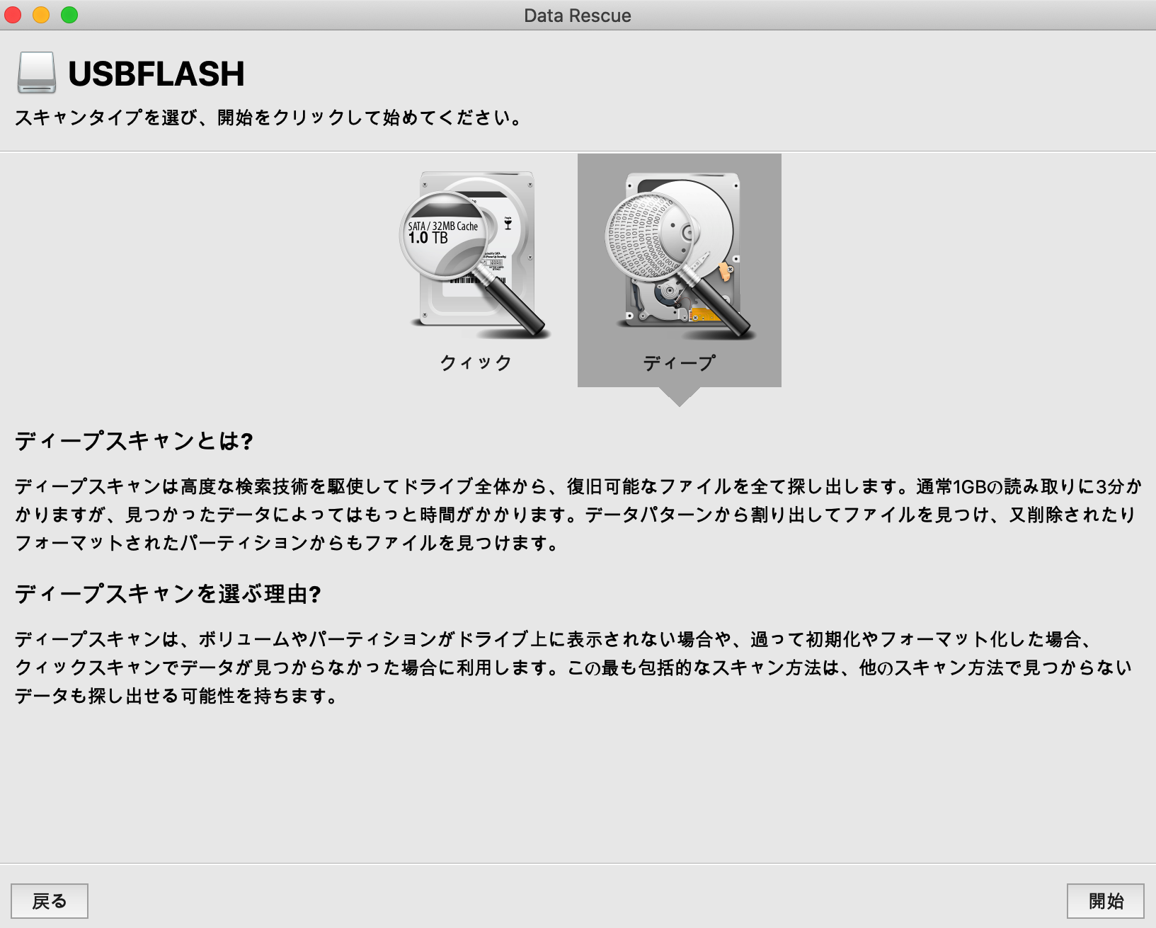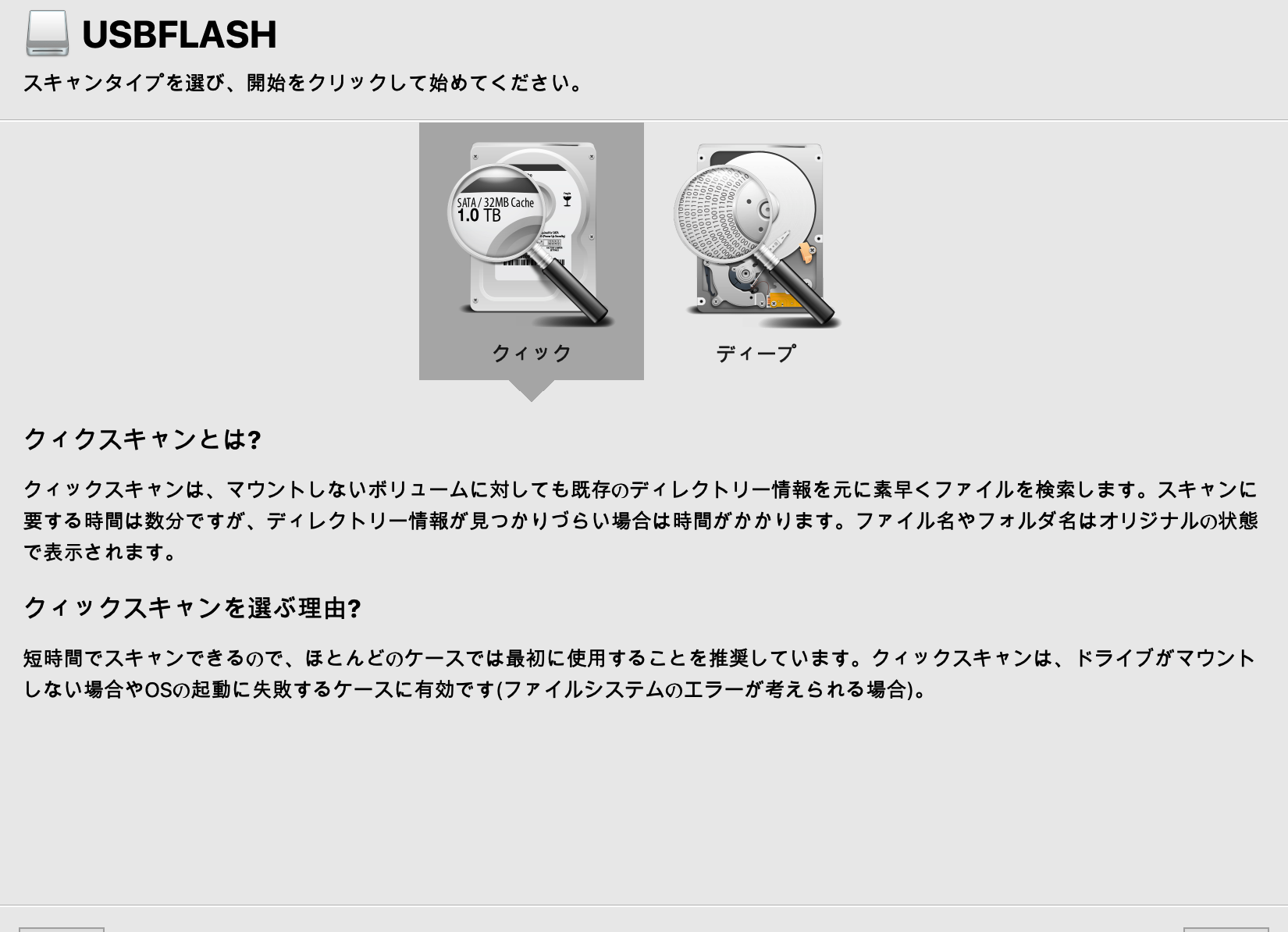 クイックスキャンで復旧したいファイルが見つからなかった場合、このスキャンを選択します。