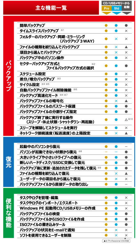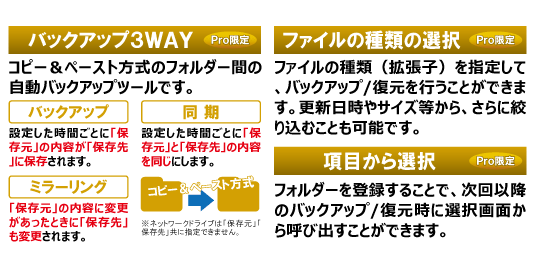 プロフェッショナル版はVer.4すべての機能が搭載されており、バックアップファイルの暗号化、バックアップ3WAY機能でバックアップ・同期・ミラーリング、FTP サーバーへの保存機能などを行うことなどが出来ます。