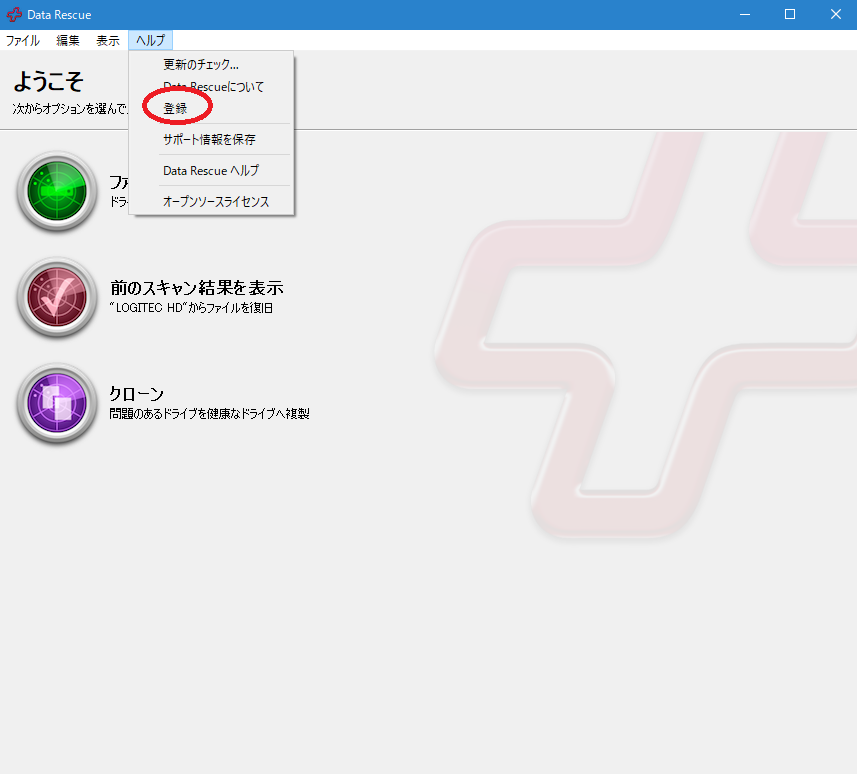 Data Rescue 6で復旧をする際にスキャン結果から、復旧したいファイルを選び「復旧」するをクリック、もしくはメインメニューのヘルプから「登録」選ぶと表示される、左図のページから「正規化コードを入力する」を選択します。