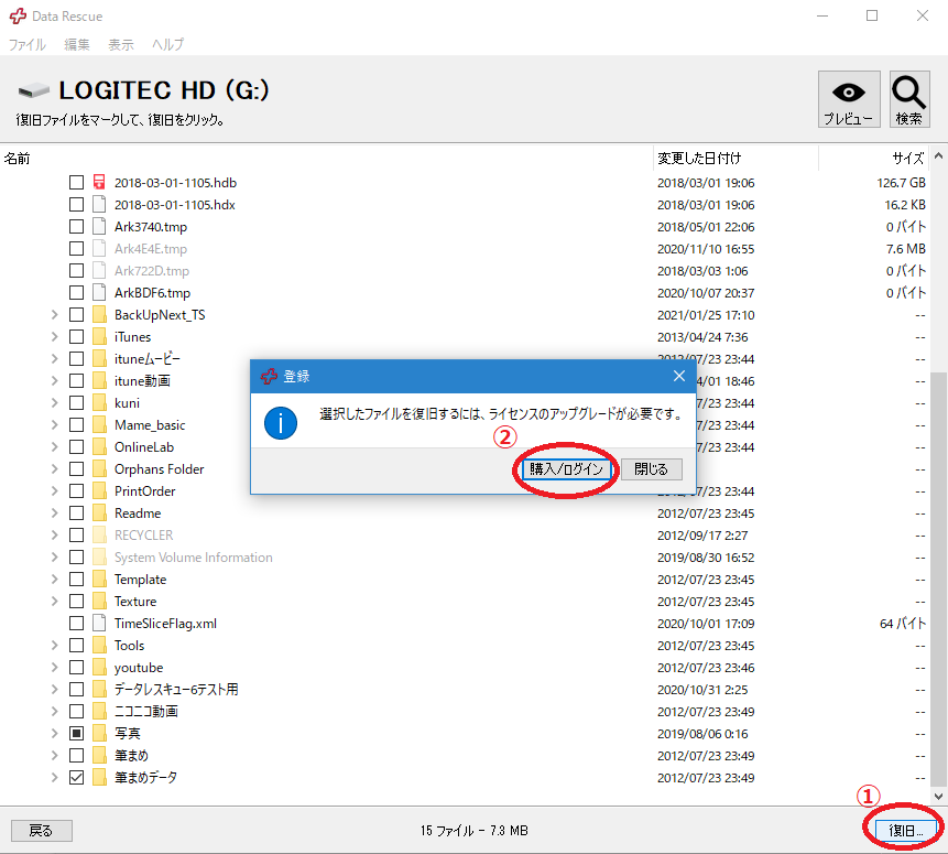 ソフトウェアの①復旧→②購入/ログインボタンから購入ページに移動できます。