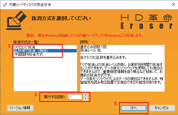 上図の「1 抹消方式」、「2 実行回数」を選択して、「3 次へ」をクリックします。