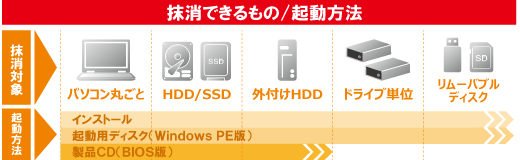 同梱の製品CD、作成したWindows PE 起動用CD/USBメモリーからパソコンを起動して、ハードディスクの抹消を行うことができます。