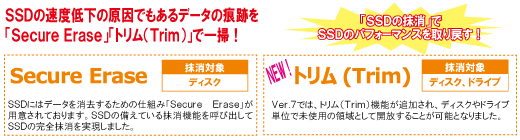 ※トリム(Trim)は、データを削除した領域を未使用領域としてSSDに通知する機能ですが、「SSDの抹消」では選択したドライブの全領域にトリム(Trim)を行い未使用領域とします。