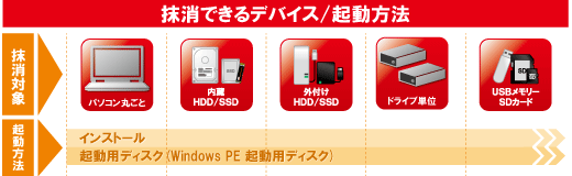 持ち運ぶ機会の多い外付けハードディスク、USBメモリーやSDカードなど、様々な外部デバイスの抹消にも対応し、情報漏えいを防止します。