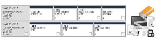 ドライブ文字がついていないドライブや空き領域がないドライブ、「未割り当て」領域に対して