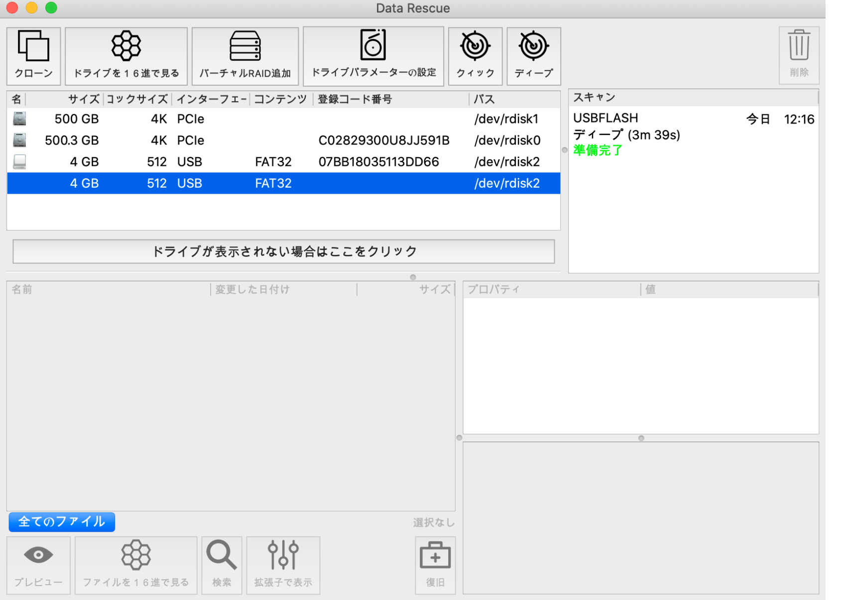 前のスキャン結果を表示から進んだ画面で過去の結果を参照します。スキャンした外付けドライブと同じ外付けドライブが接続されていることを確認します。ない場合は、スキャン結果をプレビューすることはできません「切断」と記載されます。