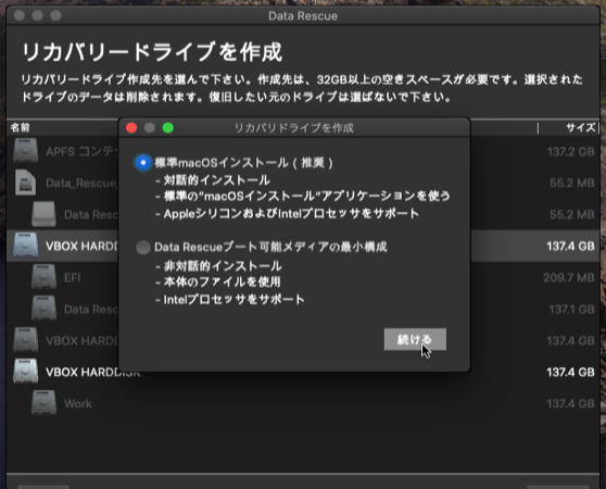 標準macOSインストール(推奨)を選び、〔続ける〕をクリックすると以下の画面が表示されます。