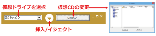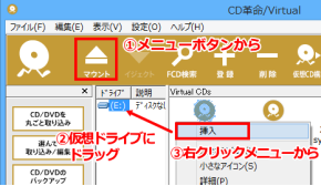 メイン画面で「Ctrl」+「Shift」+「仮想CDが挿入されているドライブ文字」の3つのキーを同時に押すことで挿入されている仮想CDを入れ替えることができます。
