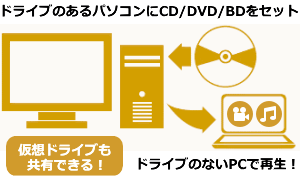 「CD革命/Virtual Ver.14」はCD/DVD/BDを丸ごとパソコンに取り込み、実物のディスクやドライブがなくても再生を可能にするソフトウェアです。●仮想ドライブとは? |