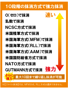 ●暗号化されているファイルも抹消することはできますが、ディスクへの書き込みは暗号化されますので選択した抹消方式で規定された値での書き込みが行われません。